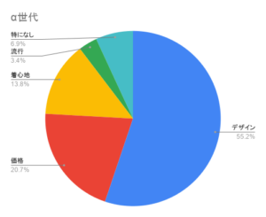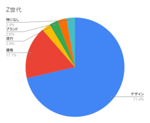 両世代ともに「デザイン」が最大の重視項目である。しかし、α世代は「価格」を挙げる割合がZ世代よりも高く、限られたお小遣いの中でいかに効率よく好みのスタイルを作るかを重視している。一方でZ世代は「着心地」や「ブランド」への意識も分散しており、質や機能性、そしてブランド背景まで含めた総合的な判断で選ぶ傾向が強い。
