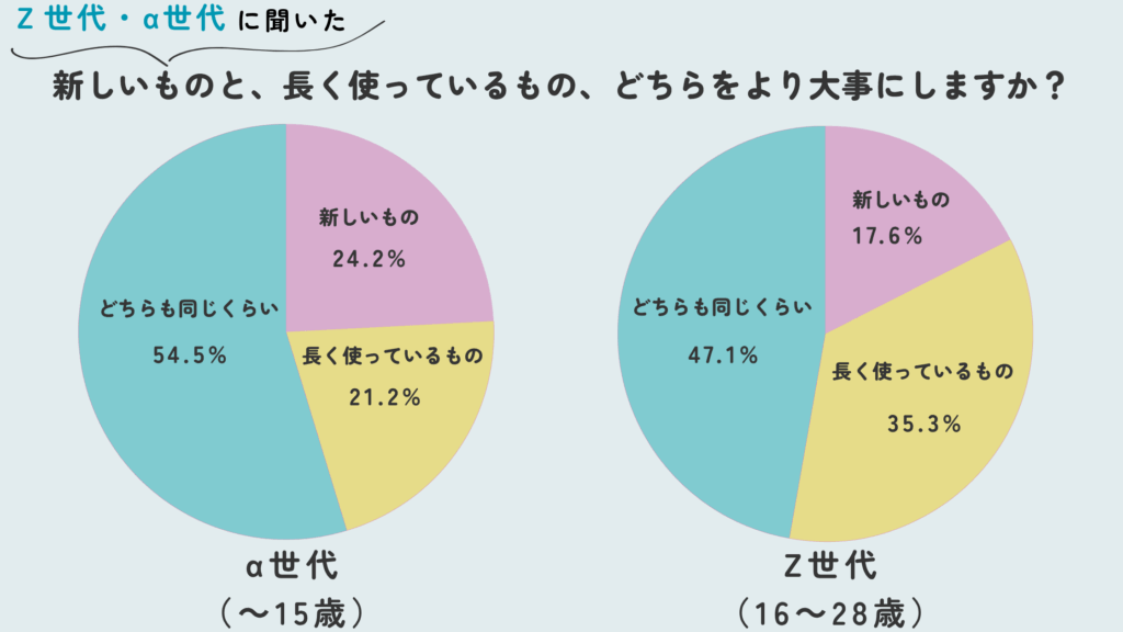 両世代ともに「どちらも同じくらい」と回答した割合が最も高い。α世代では54.5%、Z世代では47.1%と、約半数の人が新しいものと長く使っているものの両方に同程度の価値を見出していることが分かる。これは、どちらか一方に偏ることなく、状況や物の種類に応じて柔軟に価値判断を行う現実的な姿勢を表していると言えるだろう。