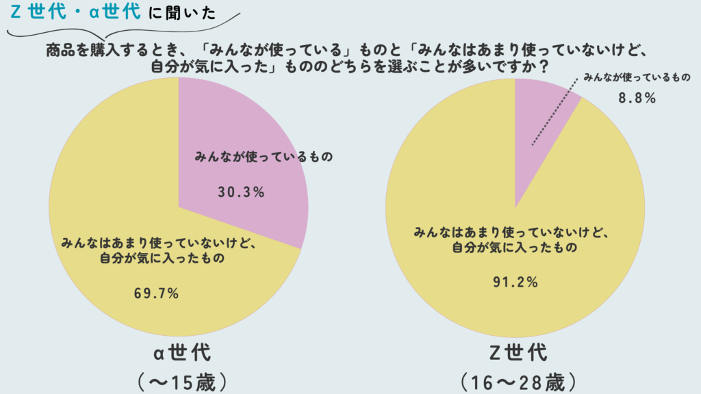 ・α世代もまた、既に「自分が気に入ったもの」を選ぶ傾向が強いものの、Z世代ほど極端ではなく、周囲との同調や多数派への安心感も一定程度考慮するバランス感覚を持ち合わせていると考えられる。