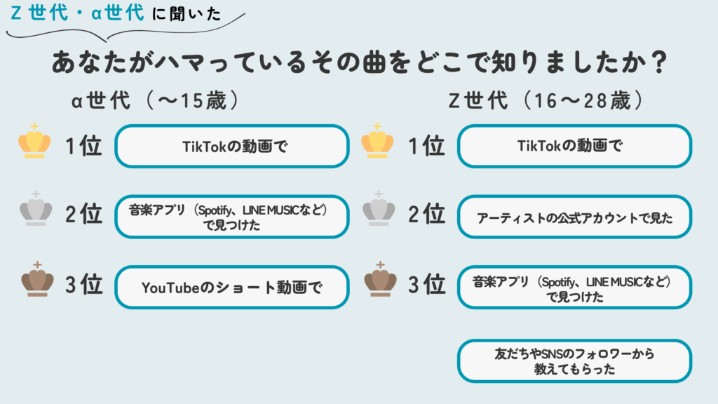 Z世代は、ショート動画プラットフォームの影響力も持ちつつも、友人からの紹介、アーティスト公式情報、音楽アプリなど、より多様なチャネルから音楽を発見している。音楽の出会い方に関するアンケートの回答がα世代よりも分散しており、特定のプラットフォームに依存しすぎない傾向が見られた。
