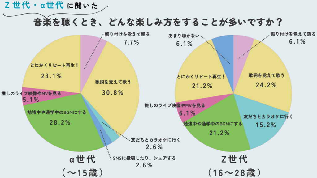 今回は、最近よく聴く音楽に関するアンケートの結果をもとに、Z世代・α世代が最近の音楽事情について皆さんにご紹介します。