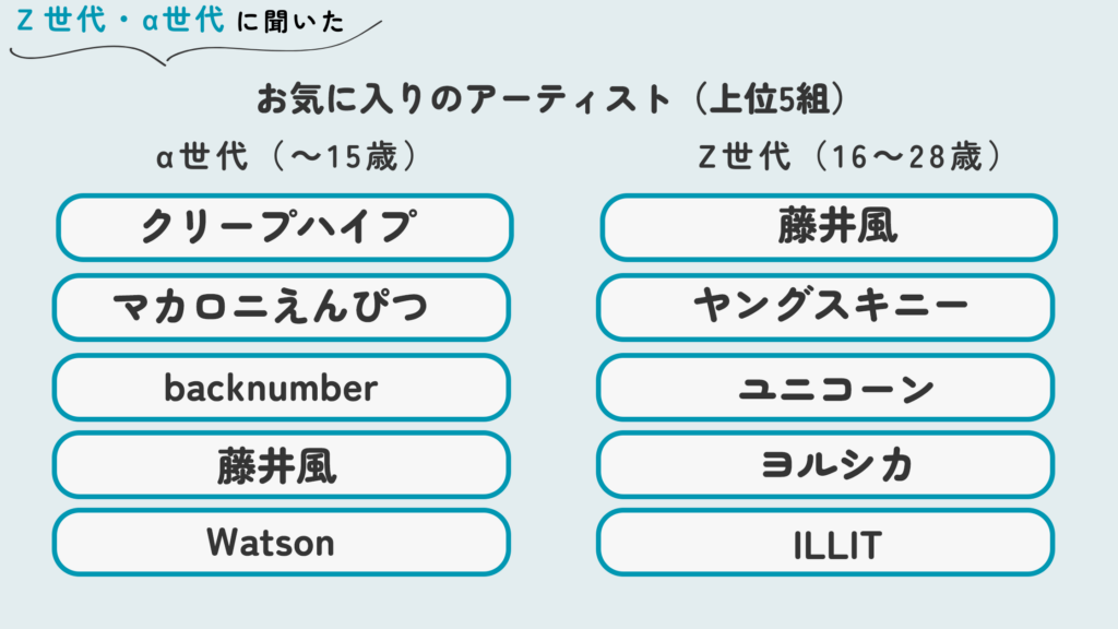 お気に入りのアーティストについてもアンケートを取った。回答のあった中からそれぞれ上位5組を紹介する。