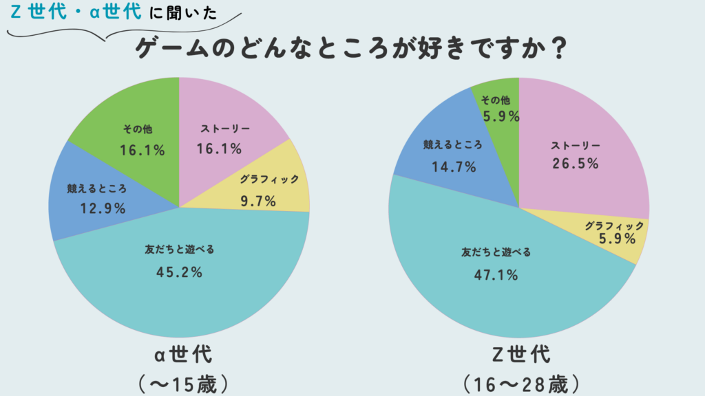 Z世代は、友だちとの交流を重視しつつ、さらに一歩進んで「物語の深さ(ストーリー)」という体験としての質を求める傾向が強まっている。これは、年齢が上がる(Z世代に近づく)につれて、ゲームに対して「交流」だけでなく「没入感(ストーリー)」や「達成感(競えるところ)」といった、より個人的・精神的な満足度を求める比重が増していると言える。