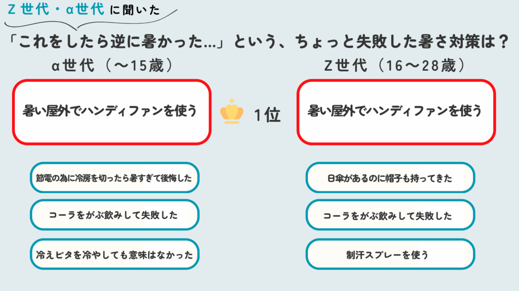 前回の「推し暑さ対策グッズ」のアンケートでは、両世代ともに「ハンディファン(携帯扇風機)」が圧倒的な人気を得ていた。これは、その手軽さ、携帯性、そして手軽に涼を感じられる即効性が高く評価されていたためである。