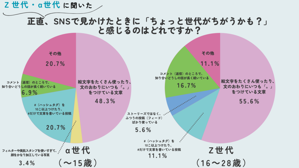 α世代・Z世代ともに、SNSにおける世代間の壁を「画像や動画の質」よりも、「テキストの書き方(句読点・絵文字・ハッシュタグ)」という言語コミュニケーションの癖に強く感じていることが分かる。特にα世代は、一時期流行したハッシュタグ文化に対しても、すでに「古い」という感覚を持ち始めている点が特徴的と言える。