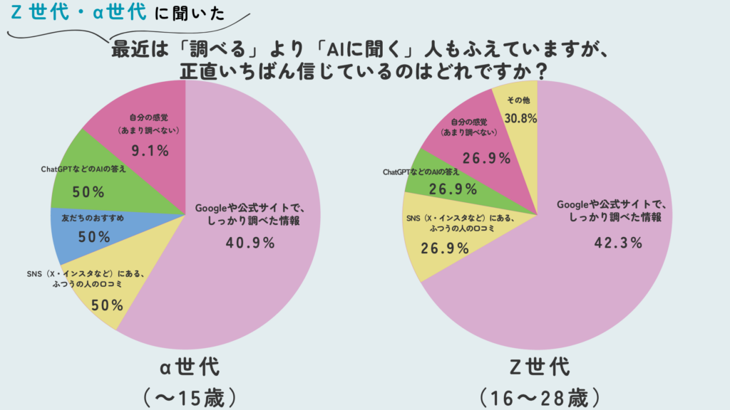 「AIに聞く」という選択肢が広がる中でも、依然として「Googleや公式サイト」を最も信頼すると回答した割合が両世代で突出している。特にZ世代では66.7%と、3人に2人が一次情報や確定情報を重視している。SNSでのデマや情報の氾濫を経験している世代だからこそ、最終的な「正解」を公式サイトに求める傾向が強く現れている。
