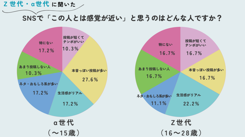 「感覚が近い」と感じるポイントは、α世代は「エモーショナルな本音」に寄り、Z世代は「リアルな生活感と適切な距離感」に寄るという微妙な差異が見られた。いずれの世代も、SNSを「理想の自分を演じる場」から「等身大の自分や価値観を反映する場」へとシフトさせている点では共通している。