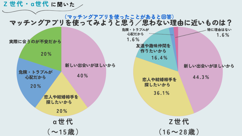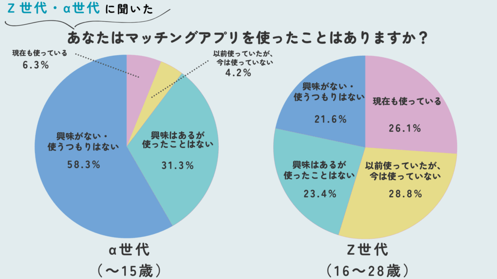 今回は、マッチングアプリに関するアンケートの結果をもとに、Z世代・α世代によるマッチングアプリの利用実態や思っているイメージについて皆さんにご紹介します。