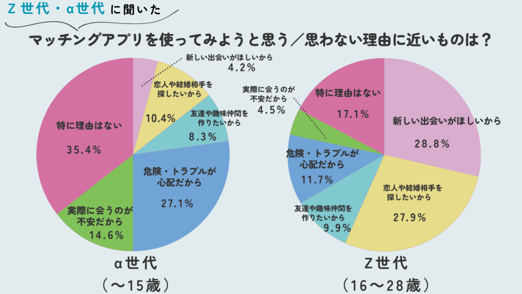 また「危険・トラブルが心配だから」と「実際に会うのが不安だから」を合わせると、α世代の約41.7%がマッチングアプリの利用に際して安全面や対面への不安を抱いている。これは、情報リテラシーの低さや未経験故の漠然とした恐怖、あるいは保護者やメディアからの情報による影響などが考えられる。