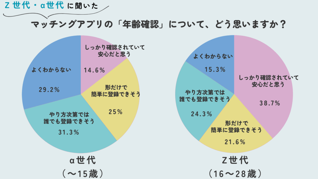 Z世代は年齢確認の信頼度が高く、アプリの安全性をある程度評価していると言える。彼らの利用経験や情報リテラシーが、年齢確認への具体的な理解と信頼につながっている可能性が高い。