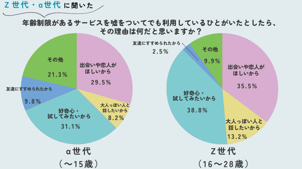 Z世代では、「出会いや恋人がほしいから」と「好奇心・試してみたいから」が非常に高い割合を占めており、年齢を偽ってでもサービスを利用しようとする具体的な動機が明確である。これは、Z世代がマッチングアプリを一般的な出会いのツールと捉えている(前回の設問)ため、より多様な出会いや、本来アクセスできない層との交流を求める欲求が強いことを示唆している。