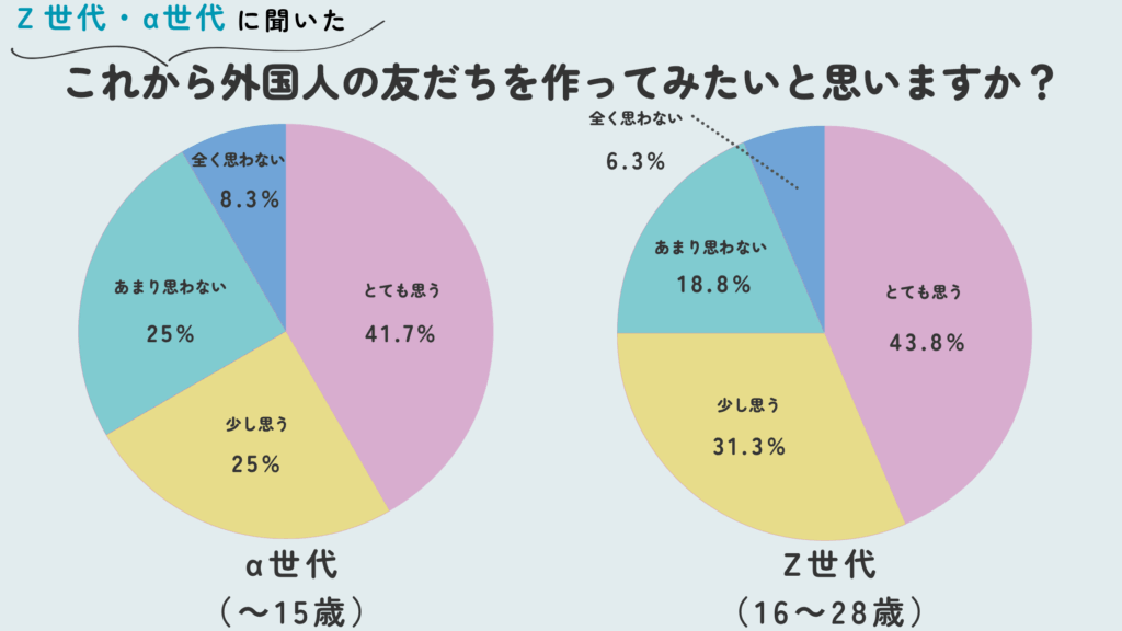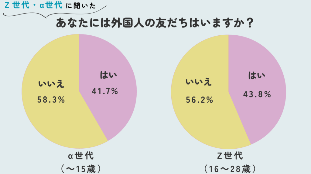 今回は、外国人の友人に関するアンケートの結果をもとに、Z世代・α世代がグローバルな友人との交流についてどのように考えているのかについて皆さんにご紹介します。