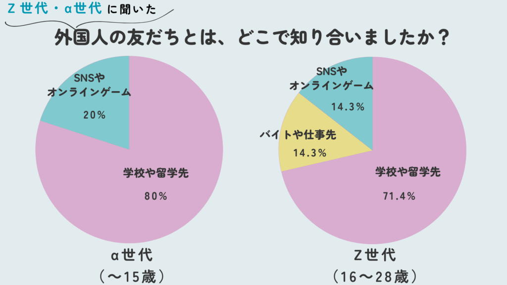 α世代の場合、外国人友人との出会いが「学校や留学先」に非常に集中しており、残りの2割が「SNSやオンラインゲーム」であった。