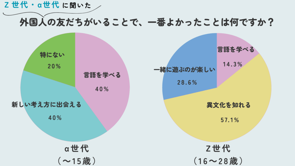 一方、α世代は、外国人友人との交流に「言語学習」や「新しい考え方」といった、より具体的で知的なメリットを求める傾向が見られた。