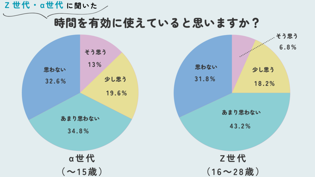 「有効に使えている派」の合計はα世代が32.6%となっており、Z世代(25.0%)より約7.6ポイント高くなっている。これは、α世代が親や学校による時間管理(スケジュール化された生活)の中にいることが多く、自律的に管理しなければならない範囲がZ世代よりも狭いため、結果として「予定通りにこなせている=有効に使えている」という認識に繋がっていると考えられる。